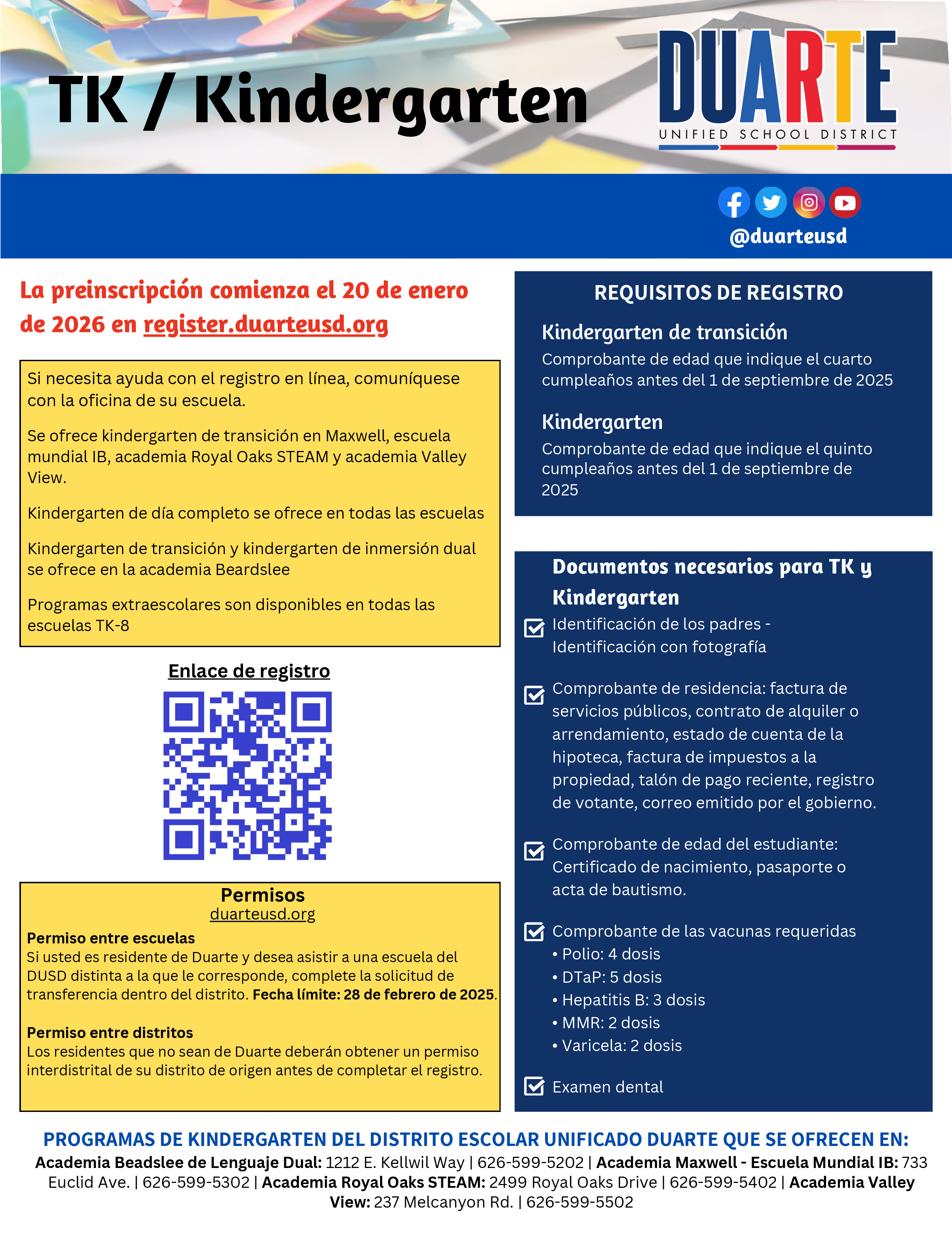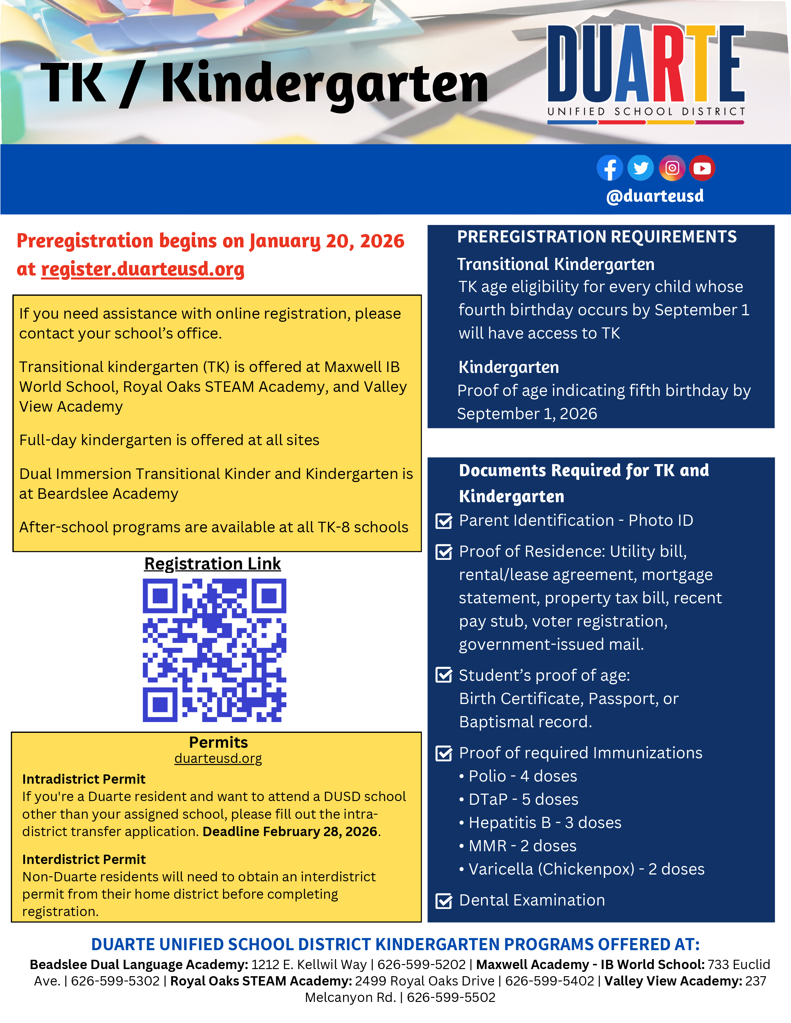 We are excited to welcome our newest learners to the Duarte Unified School District family! Transitional Kindergarten (TK) and Kindergarten registration for the 2026-2027 school year begins on Tuesday, January 20, 2026.